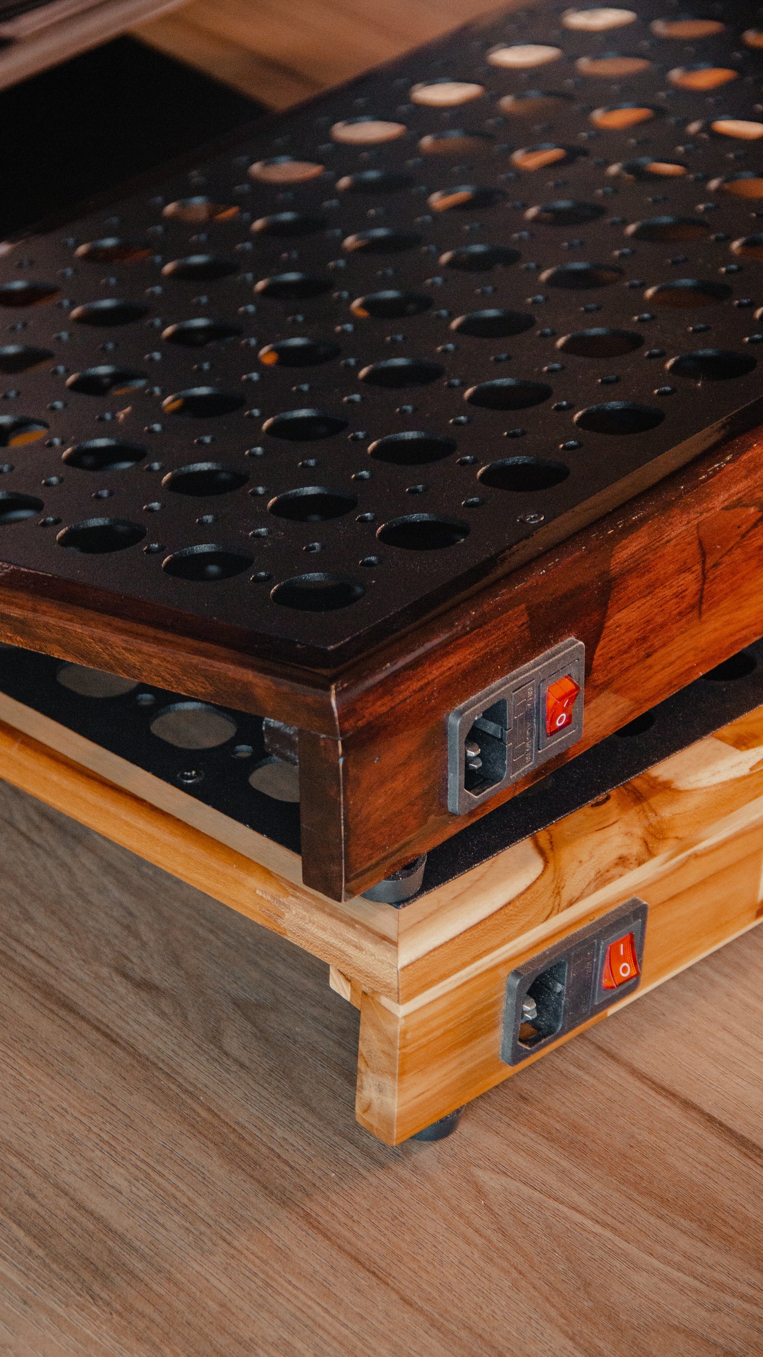 "We unite the unique beauty of mosaic teak wood with our meticulous varnish and treatment process, ensuring that each pedalboard is a masterpiece of quality, durability, and style."